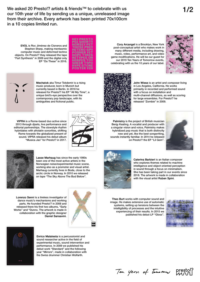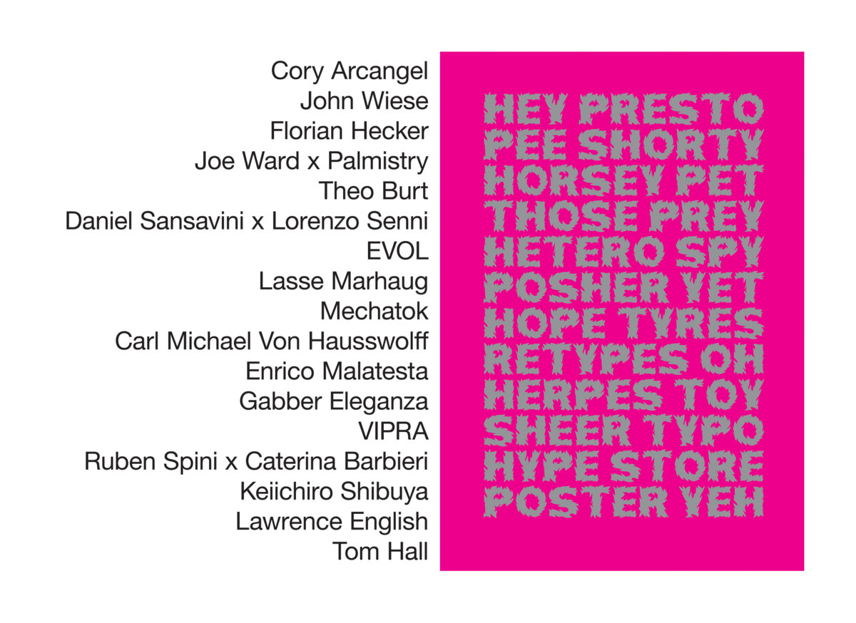 Cory Arcangel | John Wiese | Florian Hecker | Joe Ward | Palmistry | Theo Burt | Daniel Sansavini | Lorenzo Senni | EVOL | Lasse Marhaug | Mechatok | CM Von Hausswolff | Enrico Malatesta | Gabber Eleganza | VIPRA | Ruben Spini | Caterina Barbieri | Keiichiro Shibuya | Lawrence English | Tom Hall | Regular Citizen | Lena Tsibizova